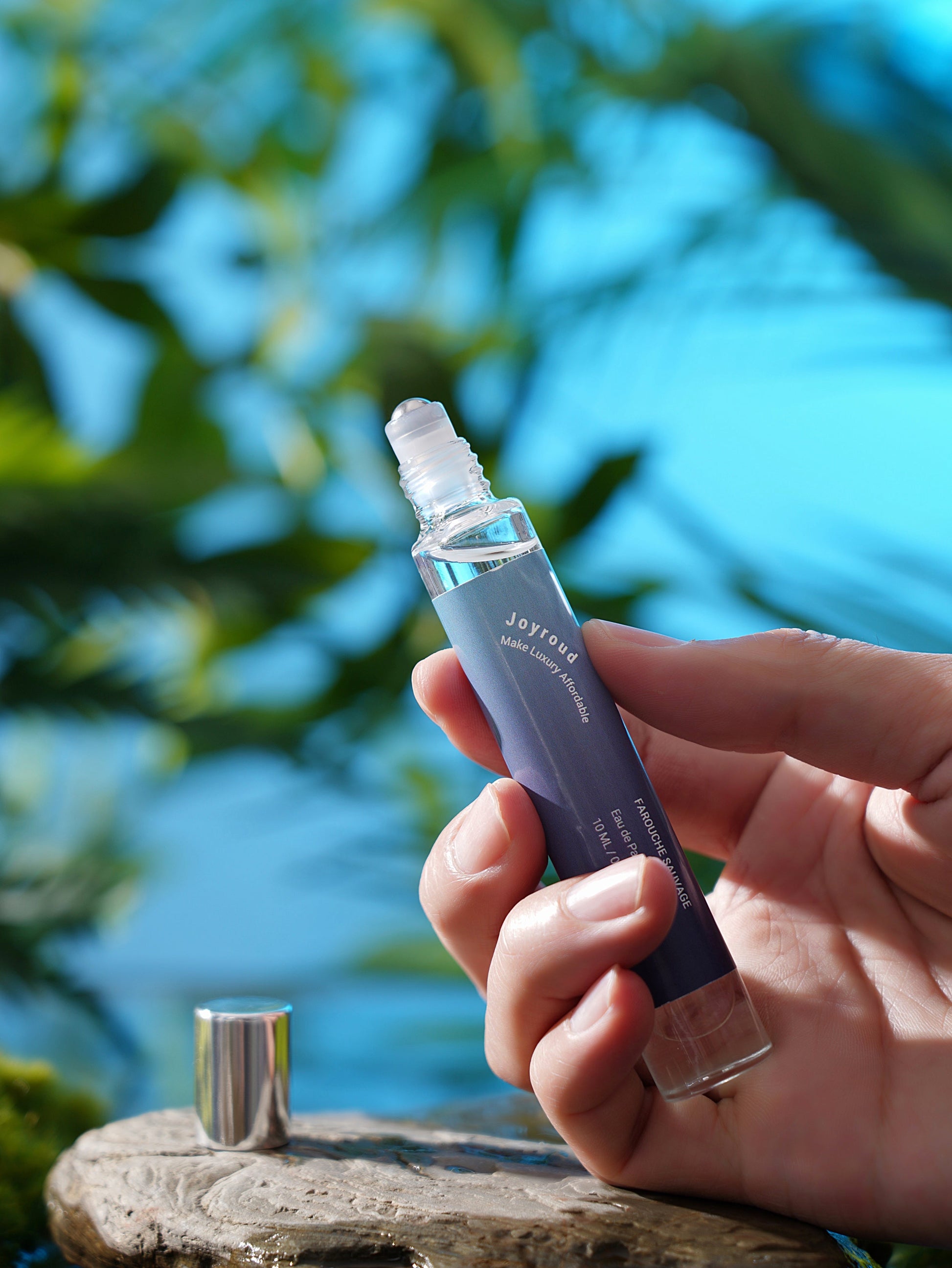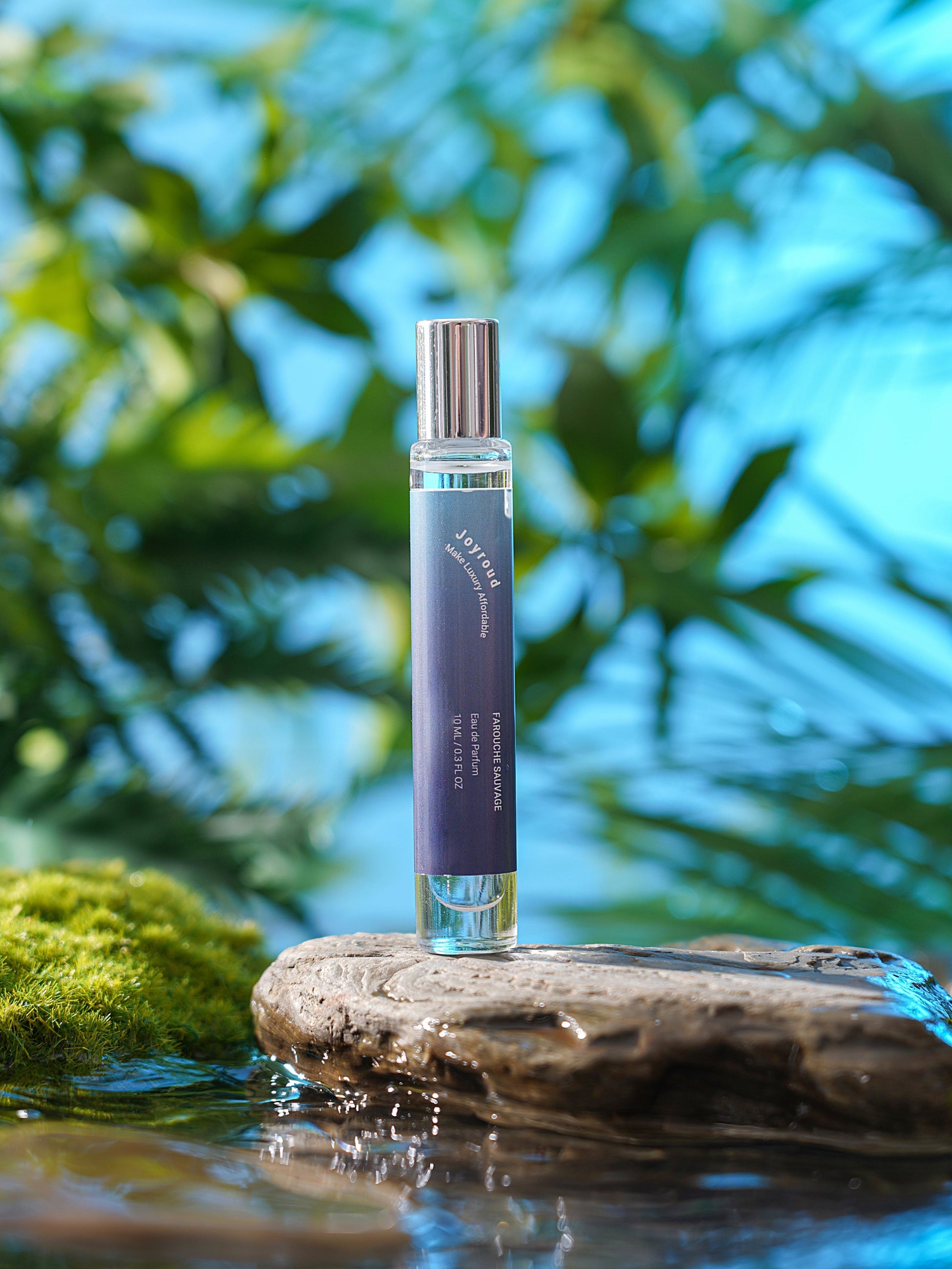 Our Farouche Sauvage 10ml roll-on perfume, inspired by the bold character of Dior's Sauvage. This fragrance bursts onto the scene with vibrant top notes of apple, pineapple, and bergamot, followed by a robust heart of rose, birch leaf, and patchouli. It settles into a compelling base of musk, oakmoss, and amber, with a touch of star anise adding an exotic twist and deepening the sensory journey. The roll-on design is perfect for the dynamic man on the move, offering a convenient way to refresh and exude strong, unmistakable masculinity wherever life takes you.